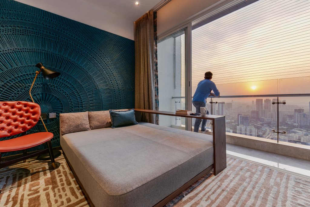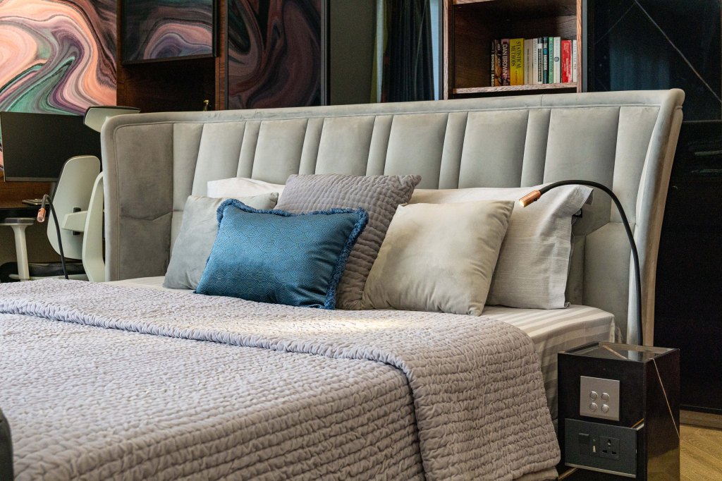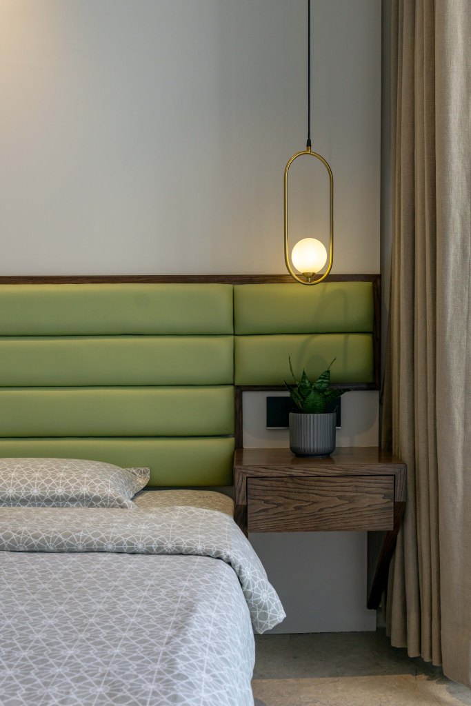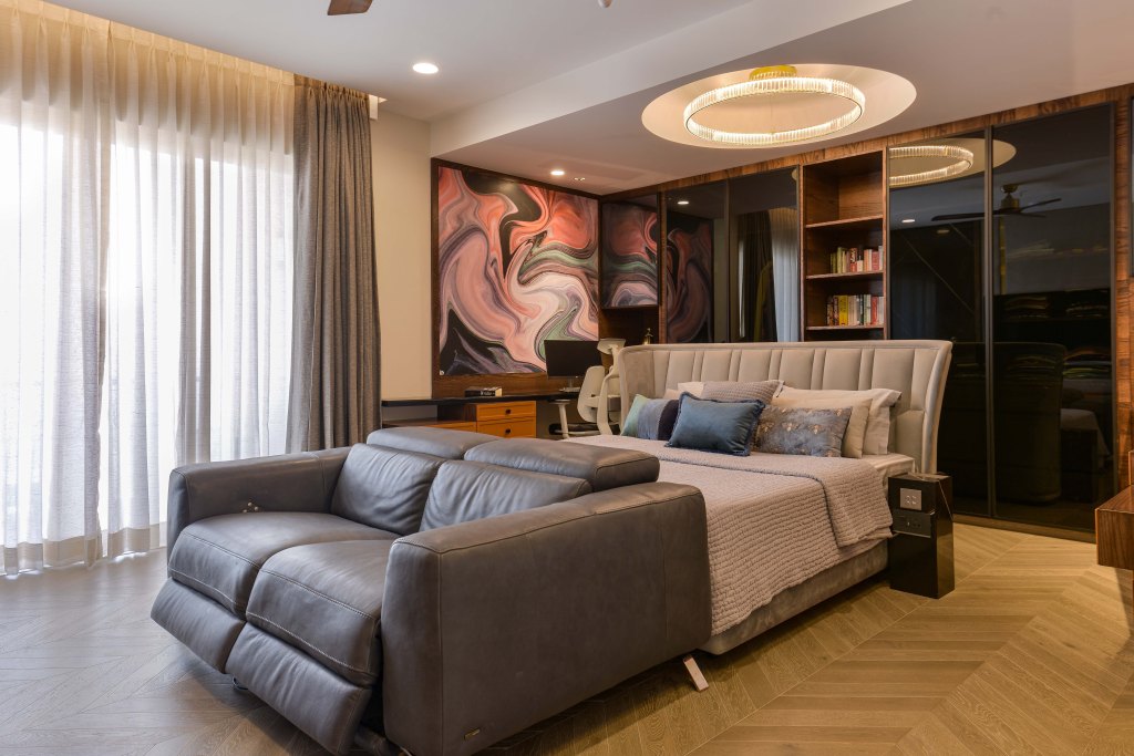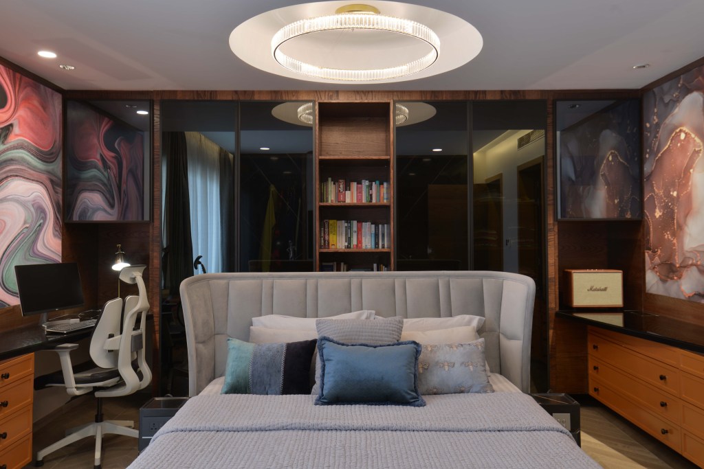 The adjoining study area houses a library with an open bookshelf flaunting the collection of books owned by the client. A custom-made study table is decorated with a pendant light providing the perfect spot for attending video meetings. The table has a well-rounded curved surface with in-built storage along with sufficient leg space for the client to work comfortably. The study accommodates a single bed which adds to the lounging experience of the room. A linear wooden hand rest runs along the length of the bed which can be used as a worktop or to keep coffee mugs, books, and pen stands. A full-length window invites natural light into the room making it a perfect reading spot for spending weekend afternoons.