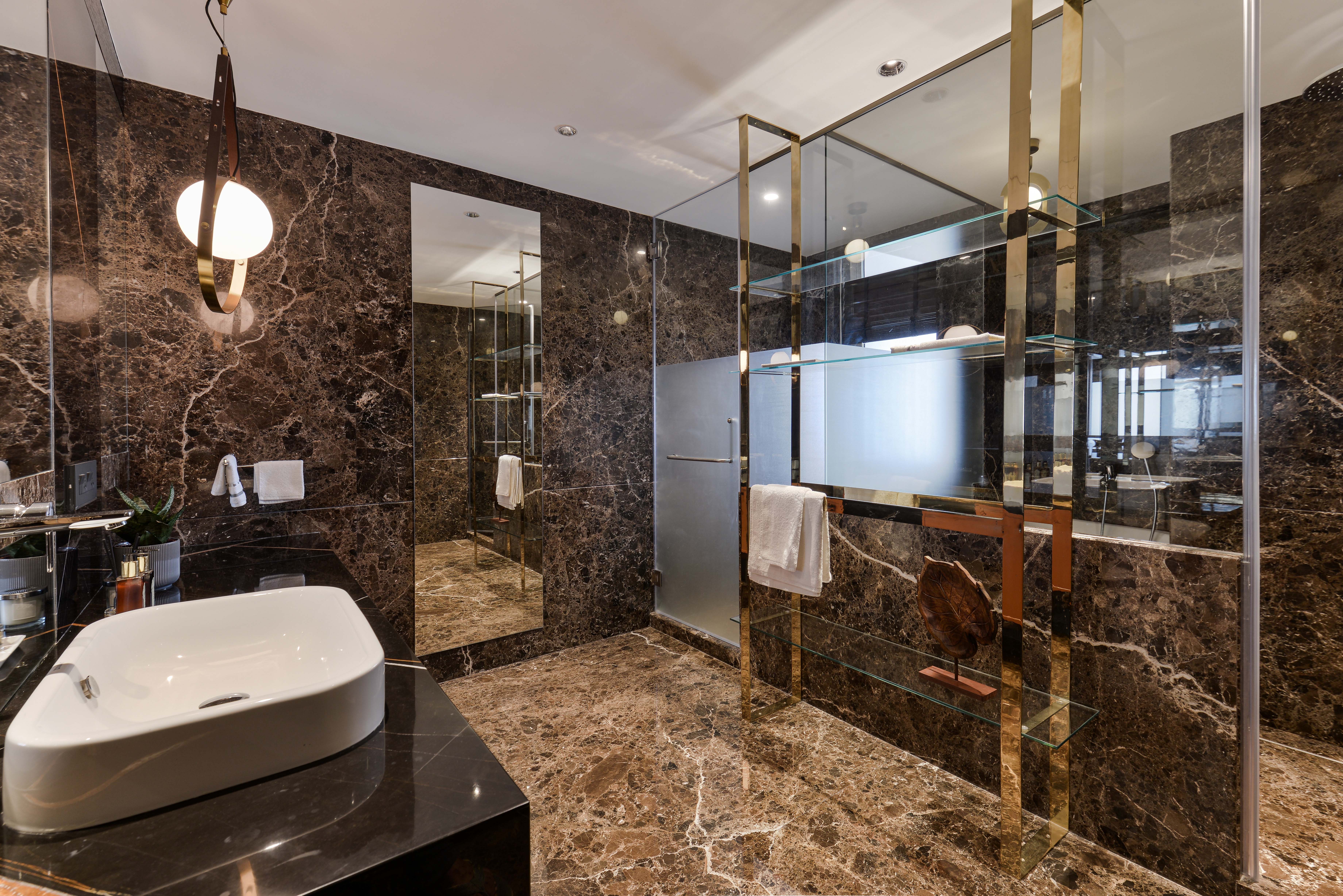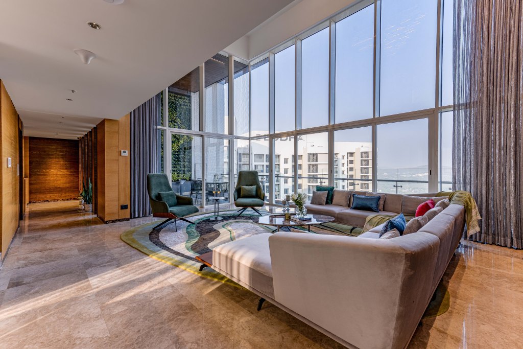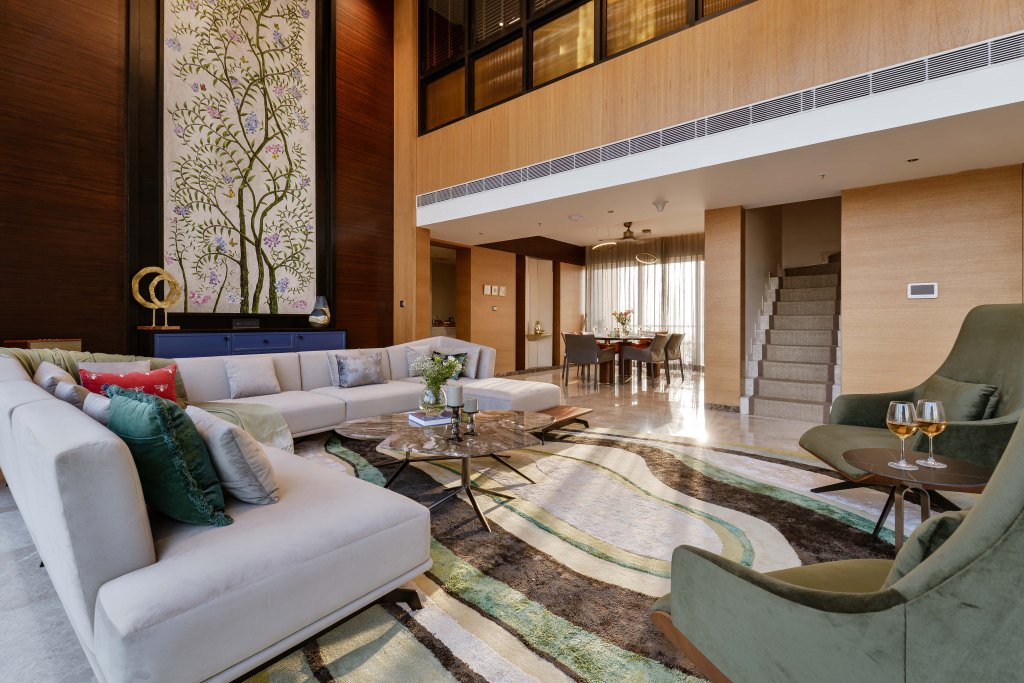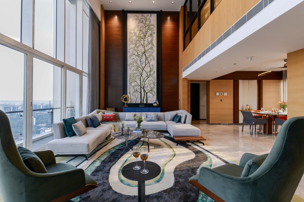 The grandeur of the double-height living area is balanced by the elongated entrance foyer which serves as a transitional space between the building lobby and the living room. The walls in the foyer embrace a muted brown veneer panelling to depict affability. Upon entering the living room, you will witness a wall-to-wall full-height window gesturing for nature to seamlessly blend with the built spaces. Covering the window is a translucent sheer allowing privacy into the space while keeping it well-lit.