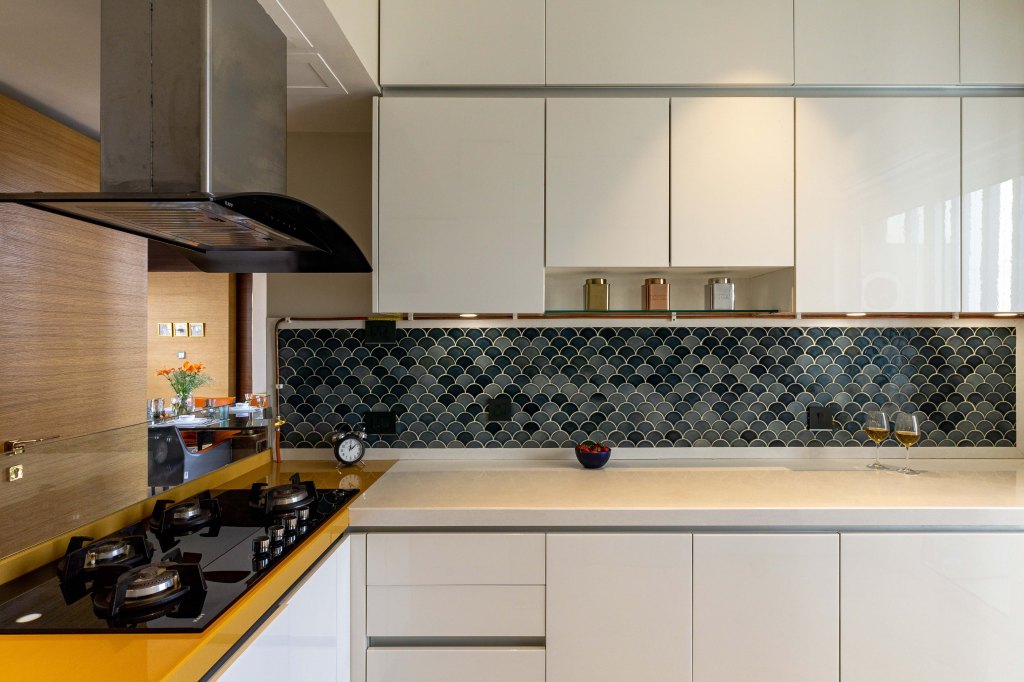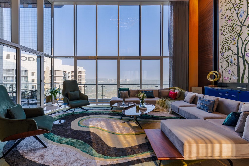 Set amidst the bustling locality of Goregaon, this 3000-square feet duplex is all about opulence and grace. This duplex overlooks the serene landscape of Aarey Colony on one side and the tranquil waters of Versova creek on the other side; making the penthouse an oasis of comfort in a vibrant metropolis. Situated on the top floor of a high-rise building, this home makes a humble impression of serenity. The house design realises the client’s aspirations of “living life king size.”