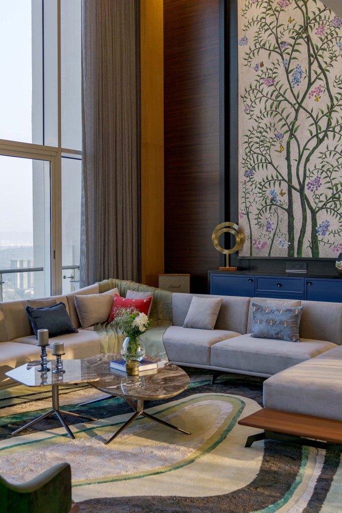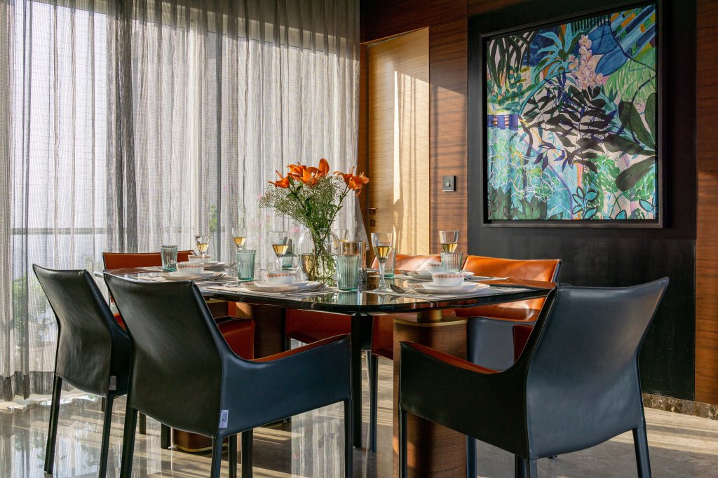 A feature wall adorned with a magnanimous tree-of-life artwork accentuates the living room. A C-shaped couch and coffee table setup placed on a custom-made rug creates a plush sitting area in front of the accent wall. A customized chandelier was designed to suit the aesthetics of the room, further adding to the elegance of the space. Adjacent to the living room is a 6-seater dining area providing a view of the neighbourhood skyline. A flowerbed beside the dining area makes the space more lively thereby helping enhance the appetite. A ring-shaped pendant light draws attention to the table making it the focal point of the space.