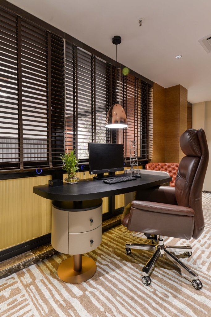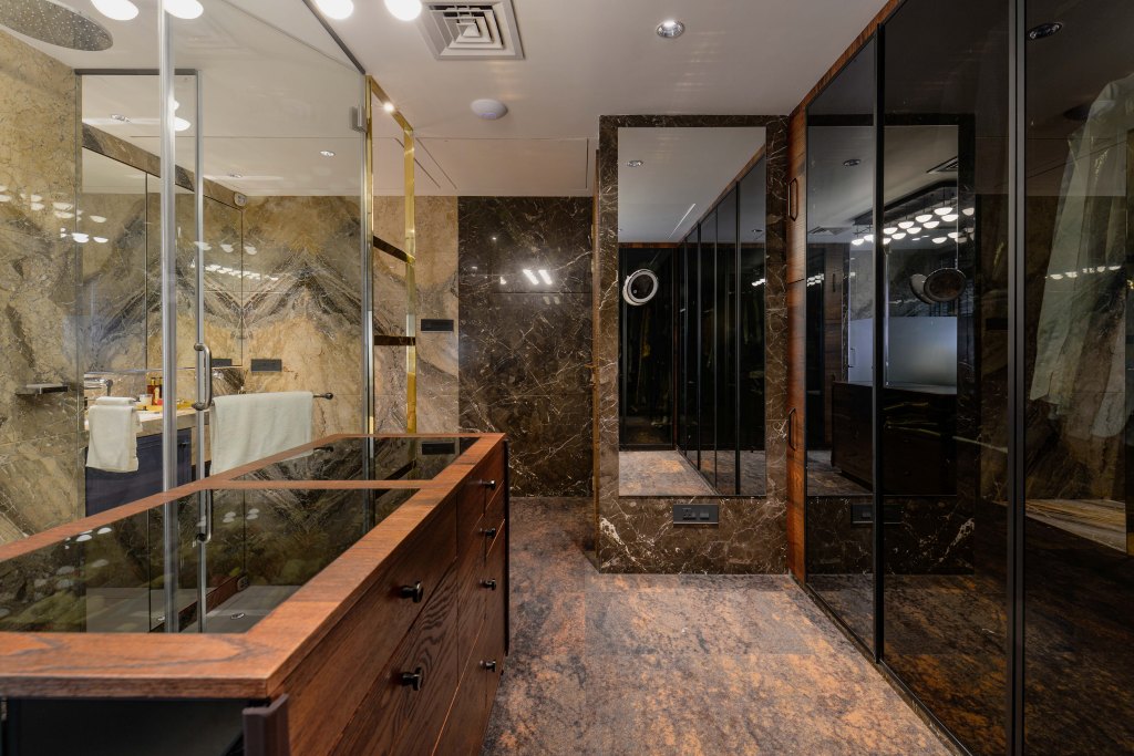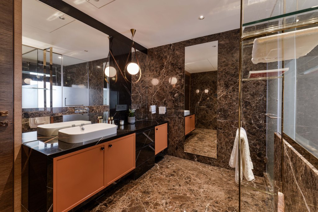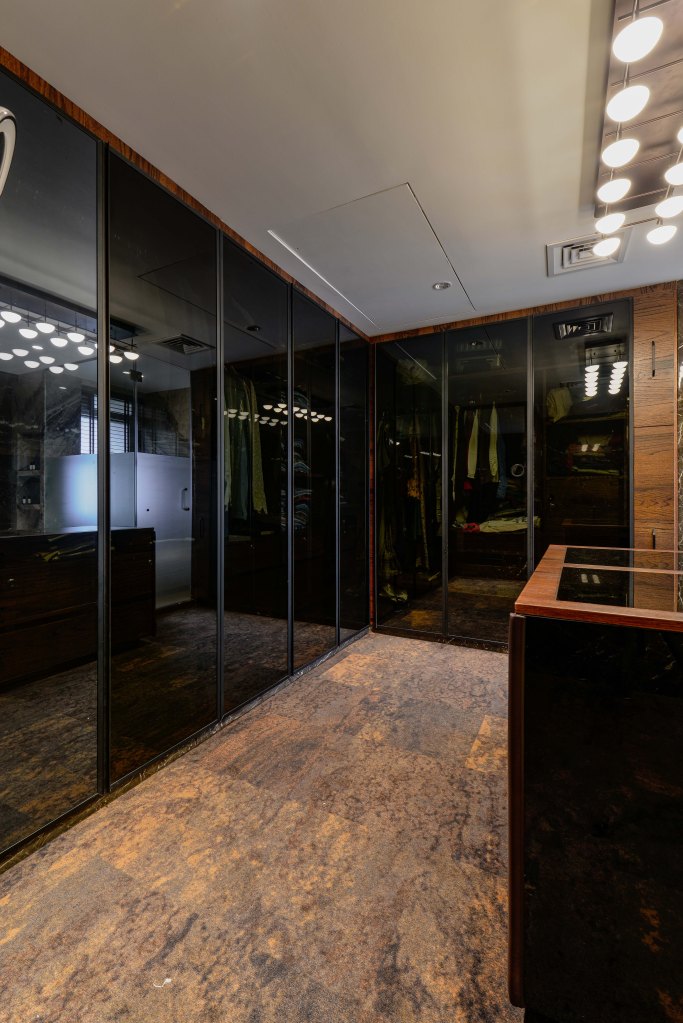 The master bedroom follows an eye-pleasing colour scheme of brown, cream, and green. Designed in a manner to exude comfort, the master bedroom is equipped with leisurely amenities. The room has an in-house bar, a mini fridge, a coffee vending machine, a television set, and a loveseat sofa- providing the perfect cocoon for a relaxing environment. Every element of the design from the sofa to the chandelier is customizer to the tee. The flower bloom-shaped chandelier placed on top of the loveseat provides ambient lighting thereby creating a lounging space in the master bedroom. The entire floor of the master bedroom is covered with a customised carpet design which seamlessly blends with the warm and natural flooring of the rest of the home.