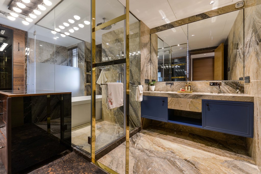Every room has an attached toilet planned with luxe surface finishes. Metallic frames, glass partitions, and natural stone flooring make the toilets appear highly aesthetic as well as functional. The patterns and grains on the floor make the space organic and fluid. Wardrobe designs with multiple shelves, drawers, and racks showcase attention to detail. All wardrobes have ample space for storing every little piece of clothing and accessory as per the requirements of the client. The colour of upholstery, veneer and laminate finishes, and bedhead panel designs are made as per client’s sense of style and liking. The subtle use of lustrous finishes, lavish materials, accent lighting, and bright coloured upholstery has made the project achieve luxury at its best. Every element of the home is designed with a hint of personalization. With fluted panels, intricate joineries, and material play doing their job, the furniture pieces reflects intricacy of design. The duplex maintains its exclusivity with a myriad of specially curated furniture and finishes that makes the home appear one-of-its-kind.