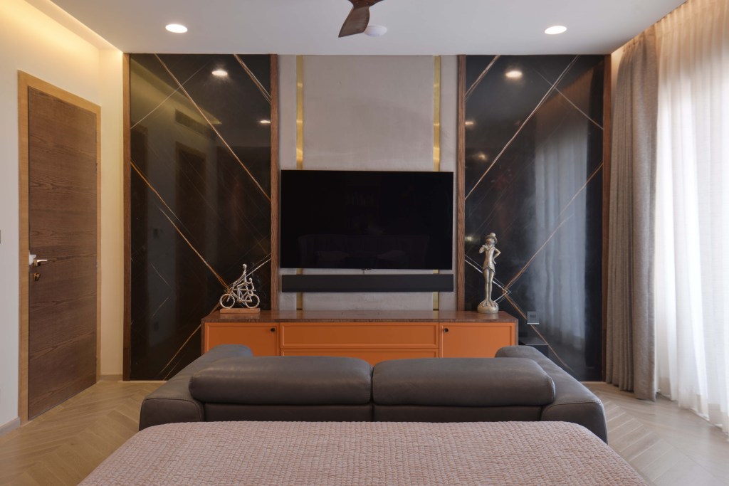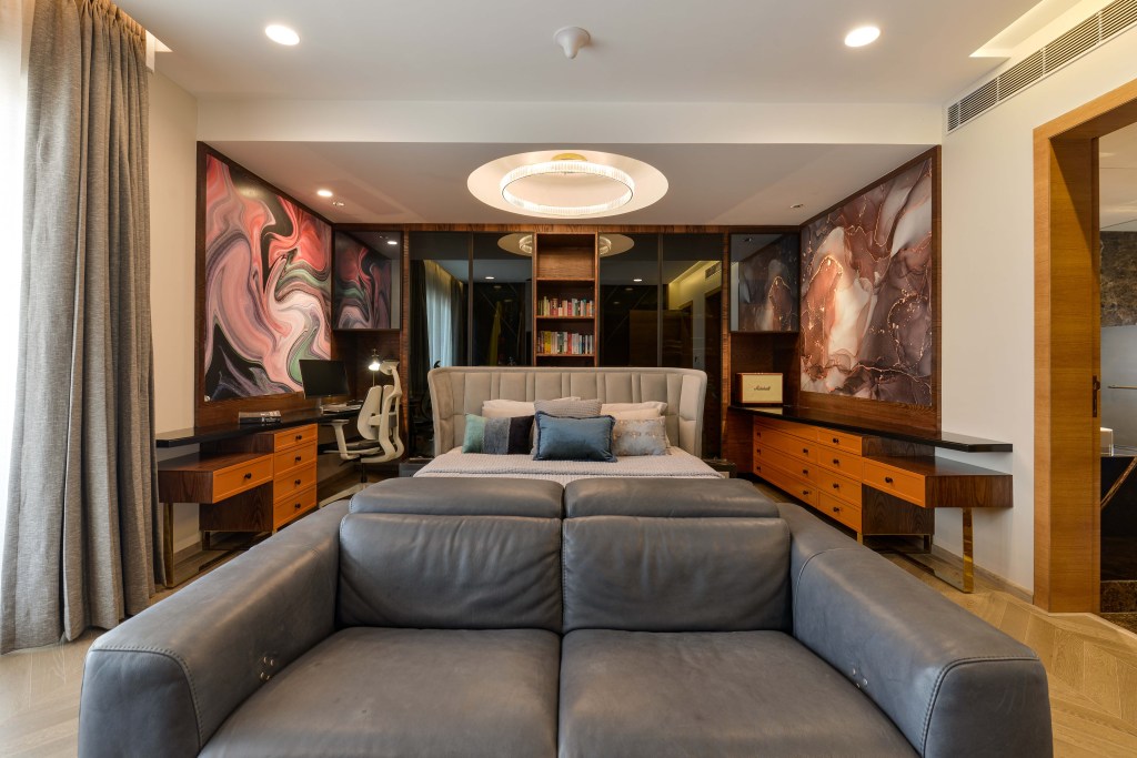 The bedroom on the base floor makes a statement through symmetrical designs depicted in everything from the ceiling to the flooring. The room is furnished with a bed, sofa, wardrobe, console table, and television set mounted on a fabric panel-cladded wall. The island bed is sided with a nightstand that has an in-built charging portal. Material patterns that continue from the ceiling to the wall blending into the flooring appear to seamlessly merge into each other.