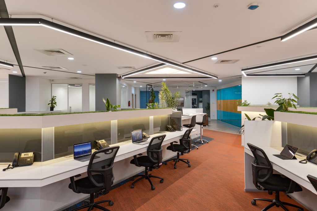The workspaces are designed in a manner to promote fluidity in design and flexibility of movement. The spaces were categorically classified into five macro zones namely Strategy Incubation (for team meetings), Idea Lab (for conferences), Interaction (for informal gatherings), Eateries (for canteen), and Working Area (for cubicles and desks). The spaces within these zones were further segregated department-wise. The work desks are designed in a zigzag fashion to break the stereotypical norm of linear workdesk arrangement. The desks are so arranged to form a semi-circular huddle, creating a space in the centre for collaborative working. The work desks are paired with other seating layouts such as individual work pods, high-rise tables and chairs to let employees work comfortably.